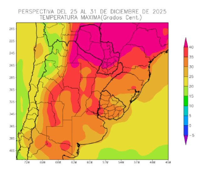 Al inicio de la perspectiva, retornarán los vientos del Trópico, incrementando marcadamente las temperaturas sobre lo normal en la mayor parte del área agrícola, con focos de calor intenso sobre su extremo norte, y sólo la franja costera atlántica observará registros cercanos a la media, haciendo que el Día de Navidad transcurra con tiempo cálido y posibles lluvias ligeras.